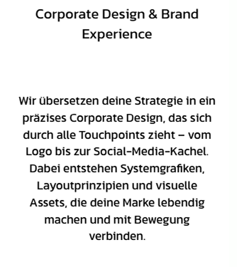 Dabei entstehen Systemgrafiken, Layoutprinzipien und visuelle Assets, die deine Marke lebendig machen und mit Bewegung verbinden.